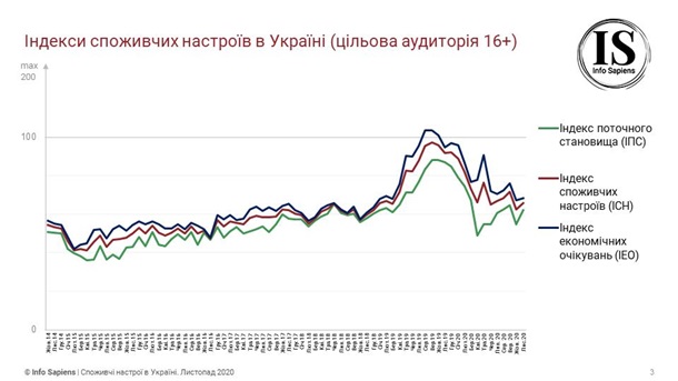 В Украине в ноябре 2020 года индекс потребительских настроений составил 65,7 п. - это на 3,3 п. выше, чем месяцем ранее. Об этом свидетельствуют данные исследования Info Sapiens, опубликованные в пятницу, 18 декабря.