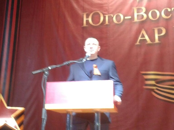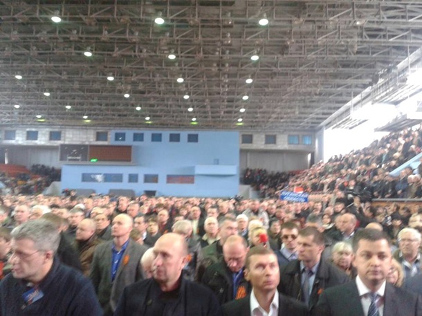 12:03 Большинство делегатов - с георгиевскими ленточками и флажками "Украинского фронта". На съезд прибыла также российская делегация в составе депутата Госдумы Алексея Пушкова, губернаторов 4 южных областей РФ.