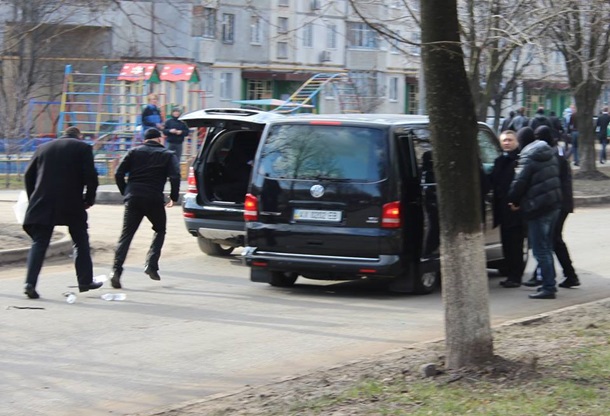 Фото удалось сделать пользователю Facebook Евгению Демченко. "Глава Харьковской облгосадминистрации убегал под возгласы: "Миша, Миша! Садись, поехали. Машина рванула так быстро, что из незакрытого багажника вылетели бутылочки с водой. Фото не очень качественные, но передают динамику того, что происходило", - пояснил Демченко.