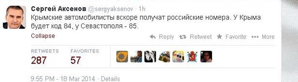 "Крымские автомобилисты вскоре получат российские намера. У Крыма будет код 84, у Севастополя - 85", - написал Аксенов в Twitter.