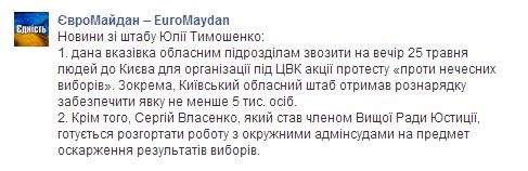 Областным подразделениям ВО Батькивщина уже дано указание свезти на 25 мая в Киев людей для проведения акции протеста под Центральной избирательной комиссией, сообщила группа Евромайдан на своей страничке в Facebook.