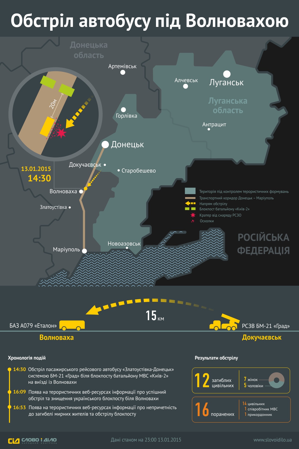 СБУ заявляет о прямом указании руководства самопровозглашенной “Донецкой народной республики“ расстрелять из установок залпового огня “Град“ пассажирский автобус возле Волновахи Донецкой области 13 января.