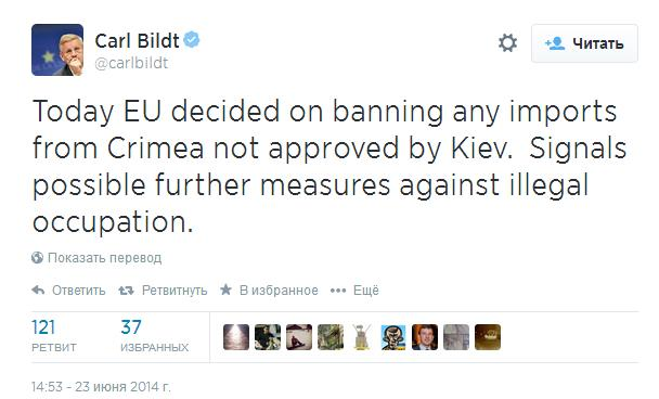 Главы МИД Евросоюза приняли решение запретить импорт из Крыма любых товаров, не одобренных Киевом, сообщил в понедельник, 23 июня, министр иностранных дел Швеции Карл Бильдт.