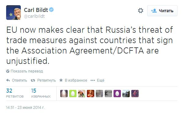 "Сейчас ЕС дает ясно понять, что угрозы России торговыми мерами против стран, подписавших Соглашение об ассоциации / DCFTA (Соглашение об углубленной и всеобъемлющей зоне свободной торговли, – прим. ред.), необоснованны", - также написал Бильдт.