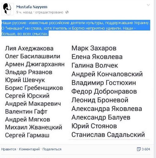 "Наши русские: известные российские деятели культуры, поддержавшие Украину. О "ненаших" ни слова, хотя Учитель и Бортко неприятно удивили. Наши - больше, во всех смыслах", - написал Найем.