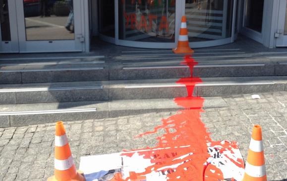 Также ко входу в банк активисты принесли флаг Народного сопротивления Донбасса и также облили его красной краской.Активисты требовали прекратить работу банка, так как он, по их мнению, причастен к финансированию протестных движений на Востоке Украины.