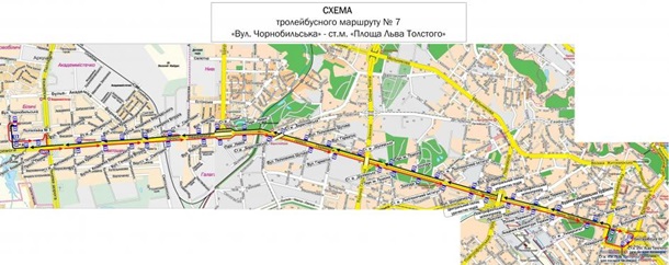 Движение троллейбусного маршрута организуют по такой схеме: улица Чернобыльская - Поликлиника №7 - улица Феодоры Пушиной - станция метро Житомирская - улица Ивана Крамского - бульвар Академика Вернадского - улица Генерала Витрука - станция метро Святошин - улица Невская - станция метро Нивки - парк Нивки - станция метро Берестейская - улица Полковника Шутова - улица Гарматная - станция метро Шулявская - Парк имени Пушкина - Киевский зоопарк - станция метро Политехнический институт - улица Шолуденко - Центральный дворец бракосочетаний - Воздухофлотский путепровод - площадь Победы - Дом национальных художественных коллективов Украины - улица Ивана Франко - улица Владимирская - Бессарабская площадь - станция метро Площадь Льва Толстого.