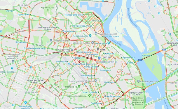 Также пробки наблюдается в районе станций метро Лыбедская, Золотые ворота, Лукьяновка, Голосеевская и Берестейская.