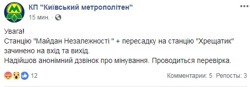 "Станция Майдан Незалежности + пересадка на станцию Крещатик закрыты на вход и выход. Поступил анонимный звонок о минировании", - говорится в сообщении.