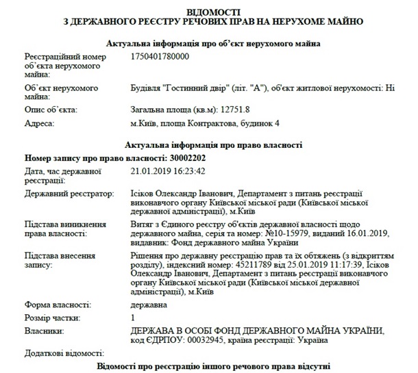 Так, 21 января Фонд госимущества был зарегистрирован владельцем здания Гостиного двора площадью 12752 кв м на Контрактовой площади, 4.