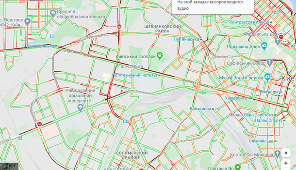 Так, согласно данным Google-карт, пробки образовались на большинстве центральных улиц, на Окружной дороге. Несколько ДТП произошло на Набережно-Крещатицкой и Гаванском мосте.
