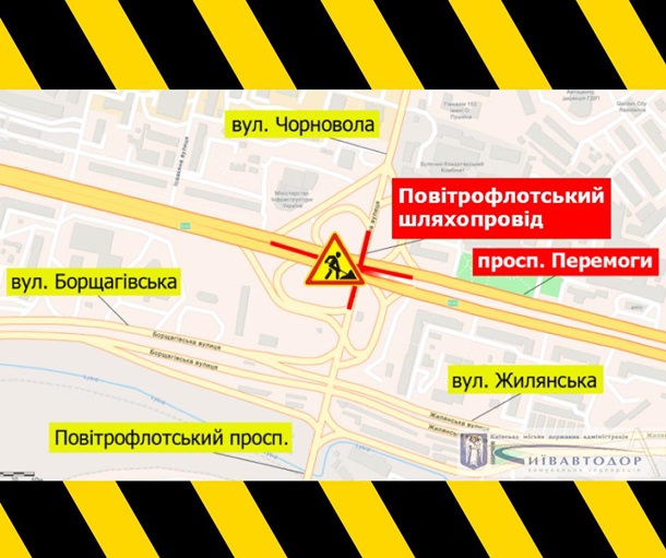 На путепроводе до 19 июля будут проводить противоаварийные работы. В это время, кроме движения на путепроводе, будет частично ограничено движение под ним на одной полосе проспекта Победы в направлении Святошино.