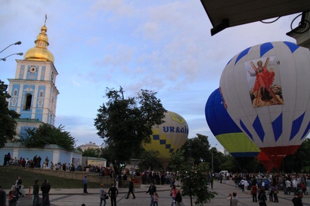 Прогулявшись по фестивальному Андреевскому спуску, можно подняться на Михайловскую площадь, чтобы посмотреть на запуск воздушных шаров в рамках Открытого кубка Киева по воздухоплаванию.