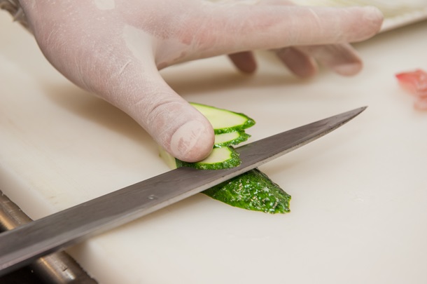 Потом нарезаем огурцы в форме веера. Это достаточно сложно, поэтому нужно попрактиковаться.