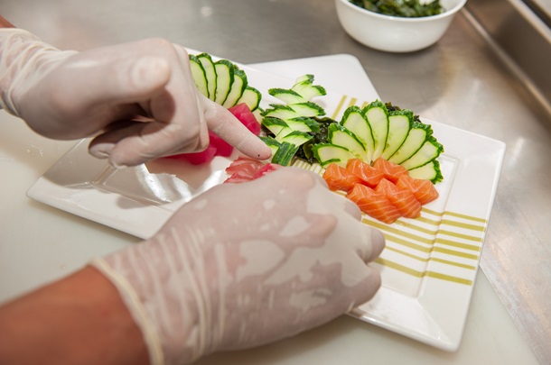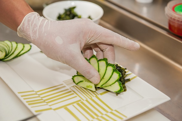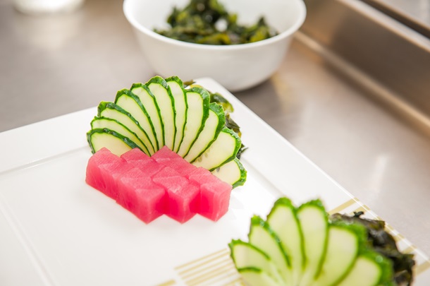 Теперь возле водорослей и огурцов красиво выкладываем рыбу.