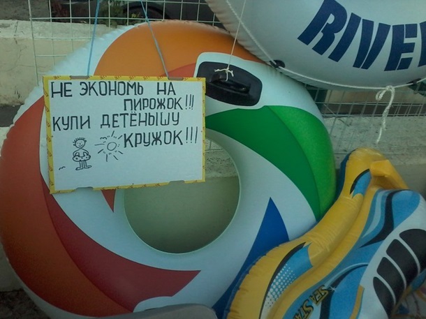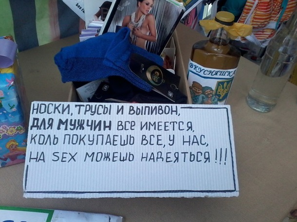 “Не экономь на пирожок, купи детёнышу кружок”, — это для детей. Их папам адресован другой призыв: “носки, трусы и выпивон, для мужчин всё имеется, коль покупаешь всё у нас, на sex можешь надеяться”.