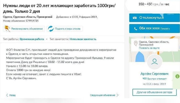 Отмечается, что участникам митинга обещали заплатить по тысяче гривен. Объявления о найме массовки размещались, в частности, на сайтах поиска работы в интернете.