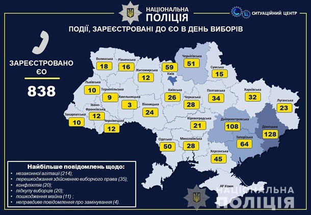 "Поступило на 13.00 838 заявлений и сообщений о нарушениях в той или иной области на выборах. Больше всего в Донецкой области - 128, Днепропетровской - 108, Запорожской - 64. В столице - 59. Они касаются всего незаконной агитации - 214 случаев. Есть подкуп - 20 случаев. конфликтных ситуаций было 18. По состоянию на сейчас составлено 6 административных протоколов ... Внесены в Единый реестр досудебных расследований 10 заявлений ", - сказал Стойко.