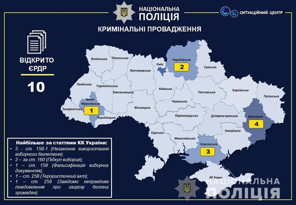 Информация по 10 фактам внесена в Единый реестр досудебных расследований. В частности, 5 уголовных производств начаты по статье о незаконном использовании избирательного бюллетеня (ст.158-1 УК Украины), два по статье о подкупе (ст.160). Остальные – по статье о фальсификация избирательных документов (ст.158).