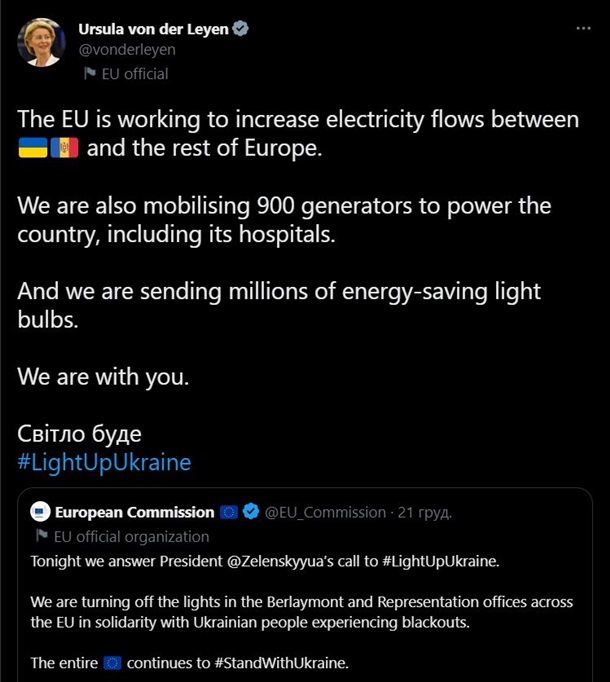 "ЄС працює над збільшенням потоків електроенергії між Україною та Молдовою та рештою Європи. Ми також мобілізуємо 900 генераторів для живлення країни, у тому числі лікарень", – повідомила вона.