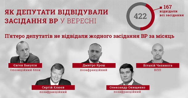 А пятеро депутатов не посетили ни одного заседания за месяц. Это член фракции Оппозиционный блок Евгений Бакулин, внефракционный Дмитрий Ярош, Виталий Чепинога из фракции Блок Петра Порошенко, а также сбежавшие внефракционные депутаты Сергей Клюев и Александр Онищенко.