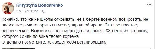 В основном украинцы возмущались случившимся, и ругали само существование кортежей в Украине и власть. Возмущались пользователи соцсетей и действиями регулировщика, который не сразу оказал помощь пострадавшему, а сначала проводил кортеж, а потом только обратил внимание на пенсионера.