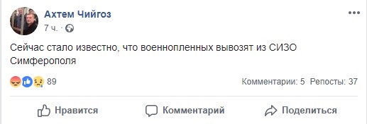 "Сейчас стало известно, что военнопленных вывозят из СИЗО Симферополя", - отметил Чийгоз.