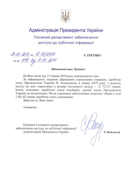 В документе указано, что за май 2019 года Зеленский получил должностной оклад в размере 12 727 гривен. При этом новоизбранному президенту не было начислено за май никаких надбавок и премий, а с самого оклада удержано 2481 грн обязательных сборов и налогов.