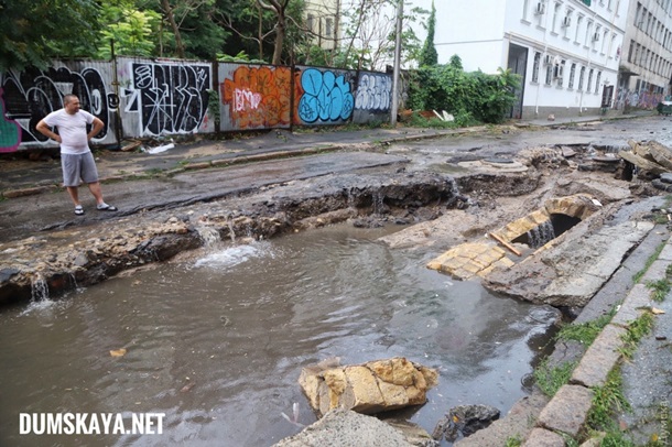 Так, на Карантинном спуске поток воды снес десяток припаркованных авто, сорвал асфальтовое покрытие и развернул ливневый коллектор.