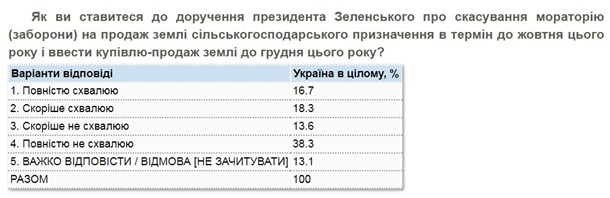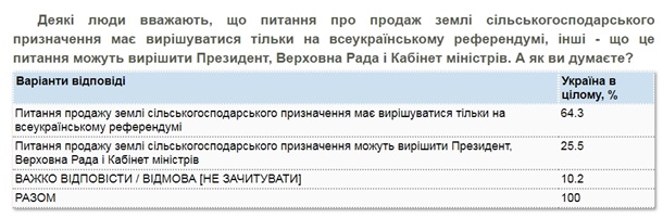 В то же время две трети украинцев (64%) считают, что вопрос о продаже земли сельскохозяйственного назначения должен решаться только на всеукраинском референдуме, 26% считают, что этот вопрос должны решать президент, Верховная рада и Кабинет министров. 10% не смогли ответить на вопрос.