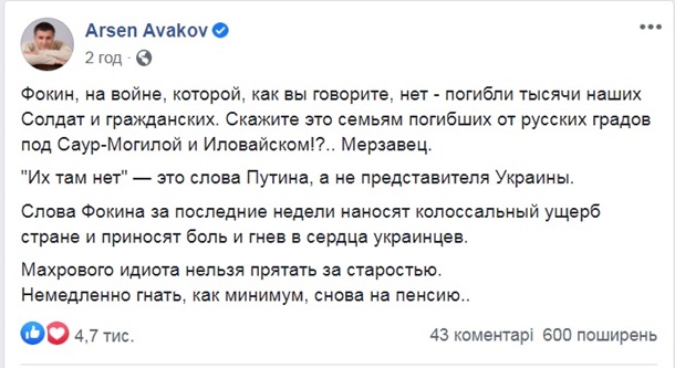“Фокин, на войне, которой, как вы говорите, нет - погибли тысячи наших солдат и гражданских. Скажите это семьям погибших от русских градов под Саур-Могилой и Иловайском!?.. Мерзавец. “Их там нет“ - это слова Путина, а не представителя Украины“, - написал Аваков.