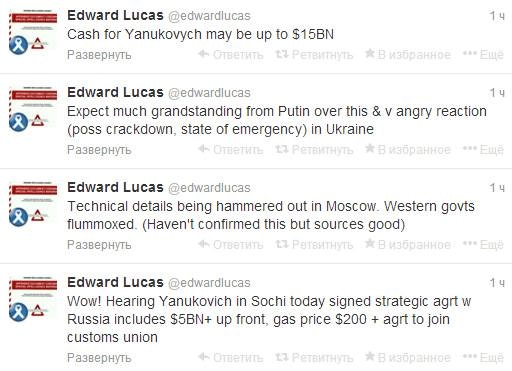 "Слышал, что Янукович в Сочи сегодня подписал стратегическое соглашение с Россией, включающую 5 млрд долл. аванса, цену на газ в 200 долларов, плюс согласие на присоединение к Таможенному союзу", - написал Эдвард Лукас, известный британский журналист, специализирующийся на тематике Восточной и Центральной Европы.