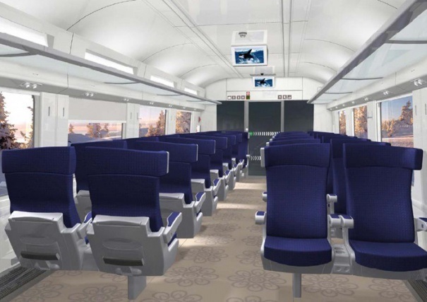 В вагонах первого класса вдоль прохода расположены ряды по два кресла. Сиденья мягкие с широкой спинкой (в 0,5 метра) с подлокотниками, подголовником и подставкой для ног. Ширина прохода 0,58 метра, расстояние между сиденьями - 1 метр. Под потолком размещены видеомониторы, есть кондиционеры и удобные полочки для багажа над сиденьями.