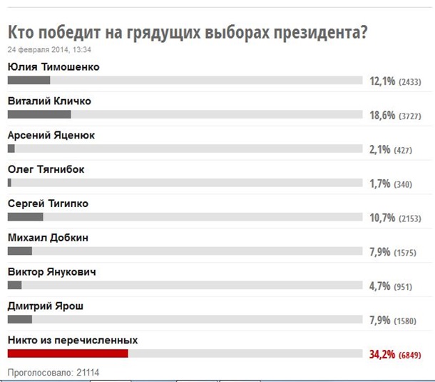 18,6 % опрошенных на сайте считают, что президентом станет Виталий Кличко - лидер партии УДАР и известный боксер.