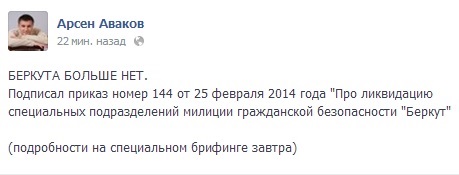Еще ранее и.о. главы МВД Арсен Аваков подписал приказ №144 от 25 февраля 2014 года "Про ликвидацию специальных подразделений милиции гражданской безопасности "Беркут".