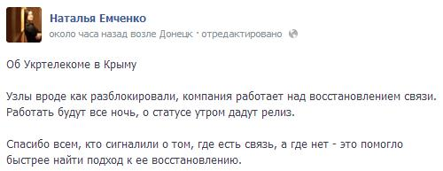 Узлы связи ПАО Укртелеком, по всей видимости, разблокированы, компания работает над восстановлением связи. Об этом сообщила пресс-секретарь холдинга СКМ Наталья Емченко на своей странице в социальной сети Facebook.