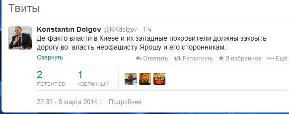 "Де-факто власти в Киеве и их западные покровители должны закрыть дорогу во власть неофашисту Ярошу и его сторонникам", - написал Долгов в своем аккаунте в Twitter.