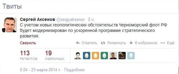 "С учетом новых геополитических обстоятельств Черноморский флот РФ будет модернизирован по ускоренной программе стратегического развития", - написал он в Twitter.