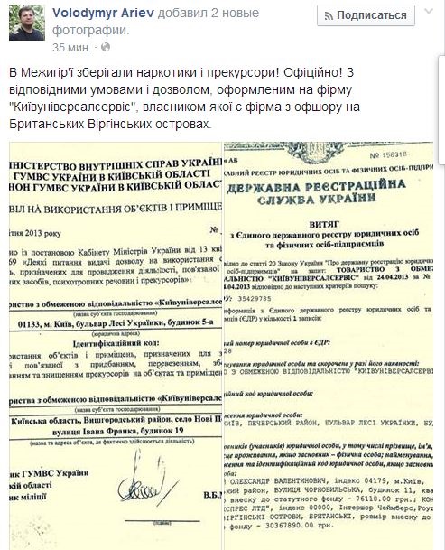 "В Межигорье хранили наркотики и прекурсоры! Официально! С соответствующими условиями и разрешением, оформленным на фирму "КиевУниверсалСервис", владельцем которой является фирма из оффшора на Британских Виргинских островах", - написал нардеп.