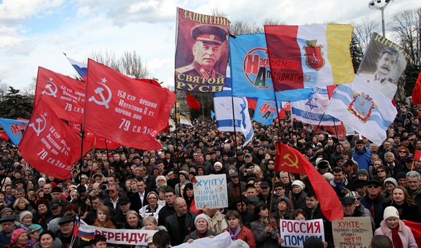 Митингующие раздают листовки с требованиями референдума и возврата экс-президента Виктора Януковича. Из динамиков транслируют речи российского лидера Владимира Путина.