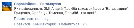 В частности, на странице сообщества появился следующий пост: "Как сообщают СМИ, Андрей Парубий также вышел из "Батьківщини". Гриценко, Оробец, Томенко, Парубий - кто дальше?"