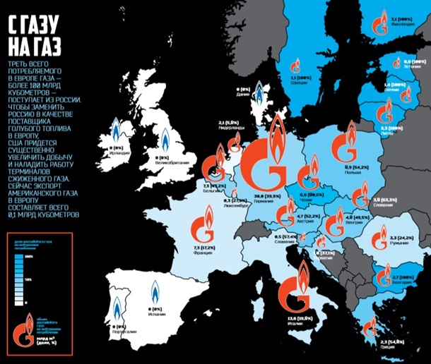 Но, несмотря на столь внушительные объемы, говорить о некоем едином европейском рынке не приходится: если, например, Испания не покупает российский газ вообще, то Болгария, Финляндия и государства Прибалтики зависимы от него на 100 %.