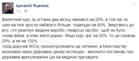 Яценюк обратился к реализаторам лекарственных средств и медицинских препаратов: "Чтобы не было так: кому война, кому мать родная. Если курс вырос на 20%, то это означает на 20, а не на 120".