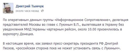 "По оперативным данным группы "Информационное сопротивление", делегация представителей Москвы во главе с Лукиным В.П., которая вылетела в Украину без предупреждения МИД Украины чартерным рейсом, около 10:00 приземлилась в аэропорту Донецка", - пишет Тимчук.