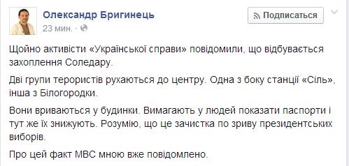 «Только активисты «Украинского дела» сообщили, что происходит захват Соледара. Две группы террористов движутся к центру. Одна со стороны станции «Соль», другая с Белогородки», - написал Бригинец.