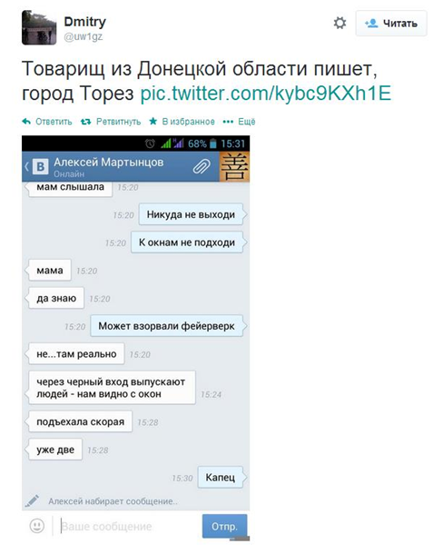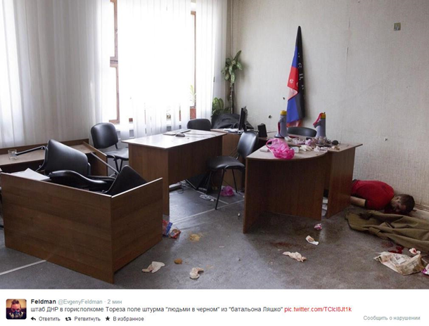 "Один человек убит, 1 ранен по итогам нападения людей в черном без опознавательных знаков на штаб ДНР в горисполкоме Тореза; тело видел сам", написал в Twitter российский журналист Евгений Фельдман.
