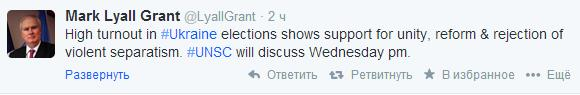 Постоянный представитель Соединенного Королевства при ООН Марк Лайалл Грант написал на своей странице в Twitter, что "высокая явка на выборах в Украине демонстрирует поддержку единству страны, проведению реформ и отрицание насильственного сепаратизма".