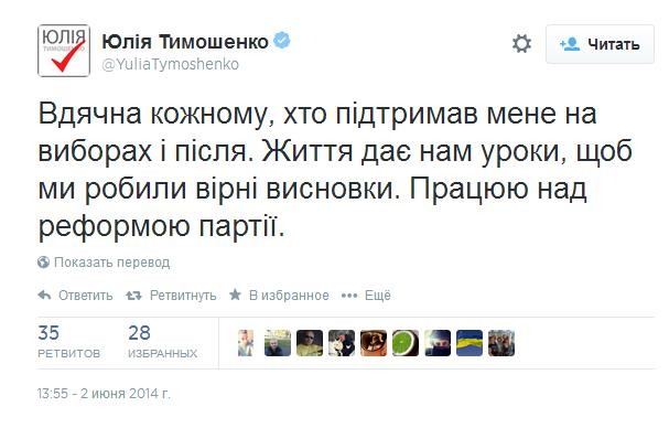 "Благодарна каждому, кто поддержал меня на выборах и после. Жизнь дает нам уроки, чтобы мы делали правильные выводы. Работаю над реформой партии", - написала Тимошенко в соцсети.
