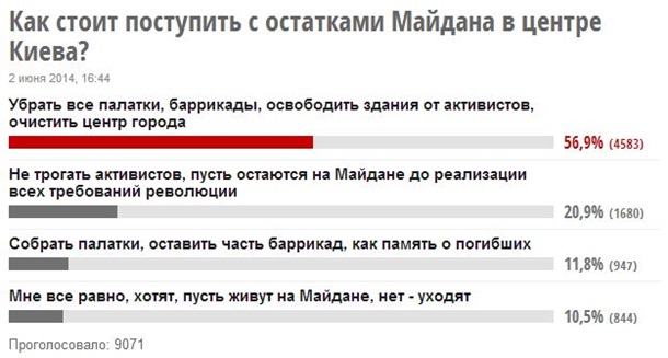 Около 56,9% читателей (4566 человек) считают, необходимым убрать из центра Киева все оставшиеся палатки и баррикады, а также освободить здания от активистов. Об этом свидетельствуют результаты опроса, проведенного на сайте Корреспондент.net.