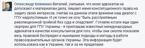 "Учитывая, что моих адвокатов не допускают к материалам дела, лишают меня конституционного права на защиту своих интересов, считаю на данном этапе времени наш диалог с ГПУ недопустимым. И уж точно не хочу "быть расстреляным революционной тройкой без суда и следствия", - написал Клименко.